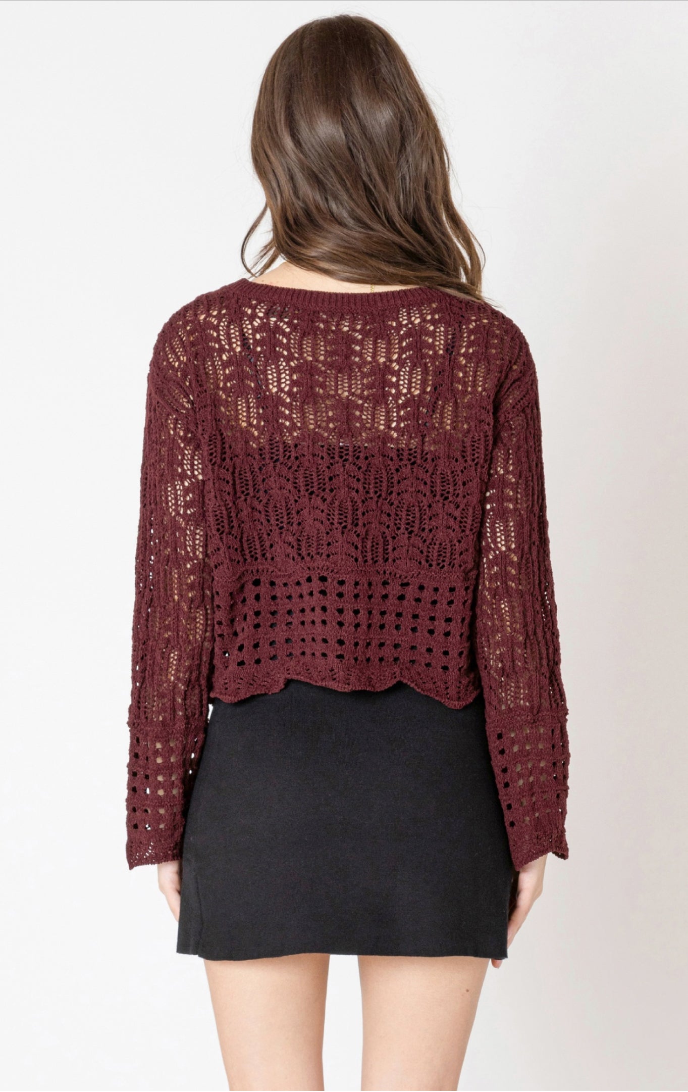 Discover the perfect combination of style and comfort with our Dex Knit Sweater. Crafted with a wavy hem and open stitch, this wine-colored sweater offers a boxy fit and boasts a fabric made of high-quality polyester. Part of our Fall 2025 collection, it's a must-have for the fashion-forward individual.
