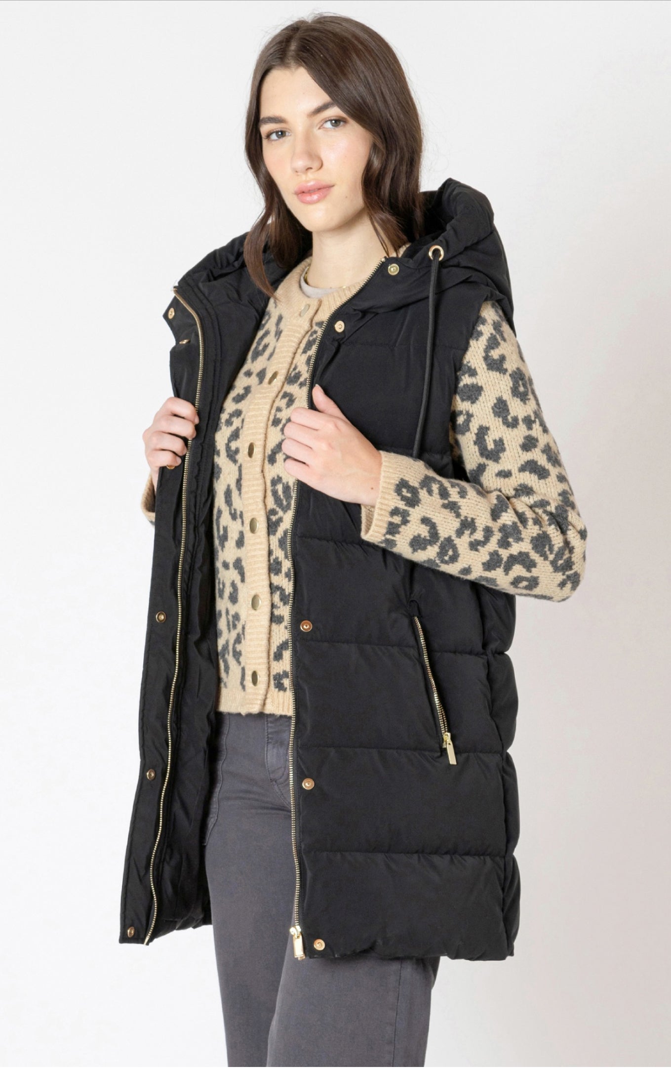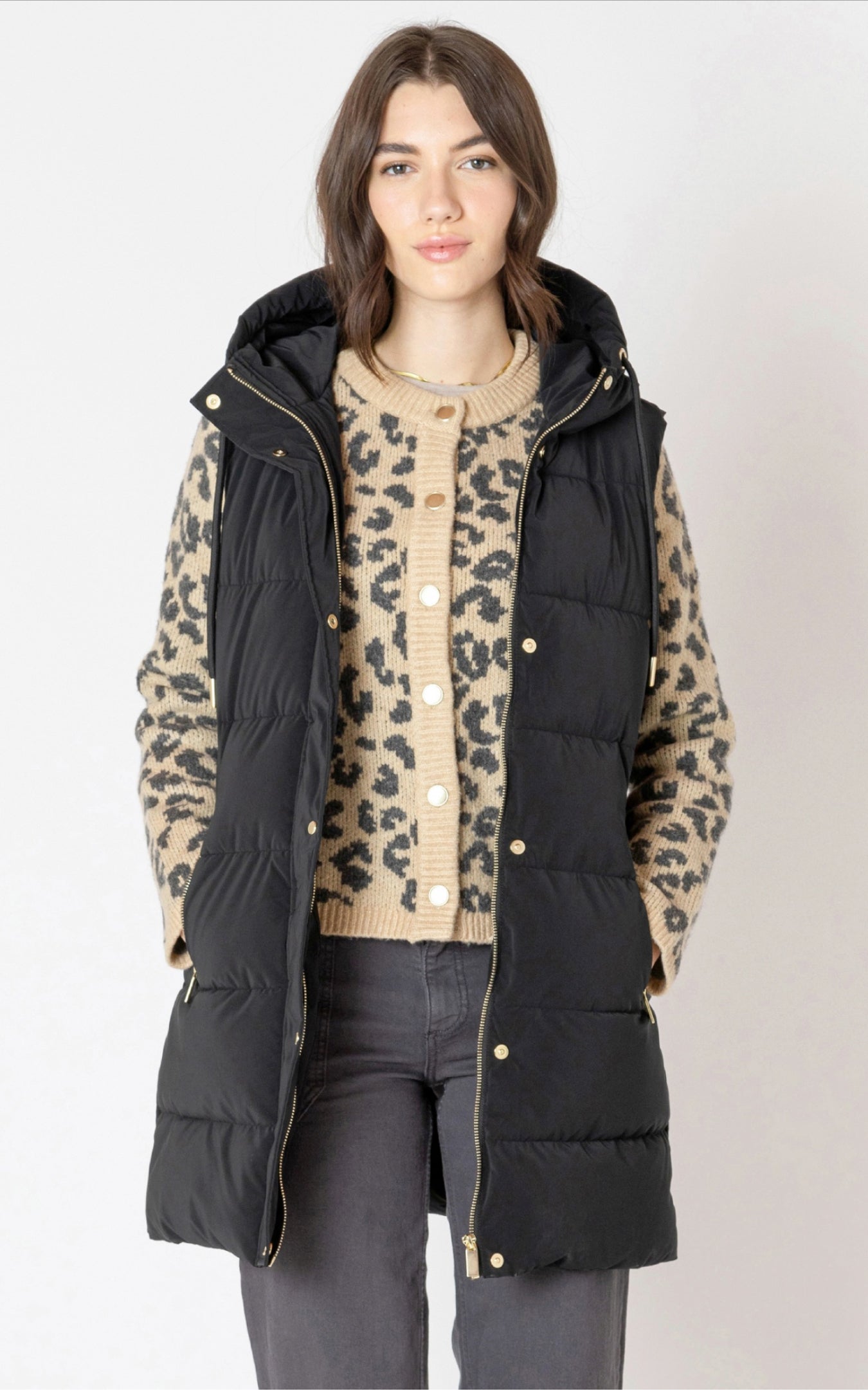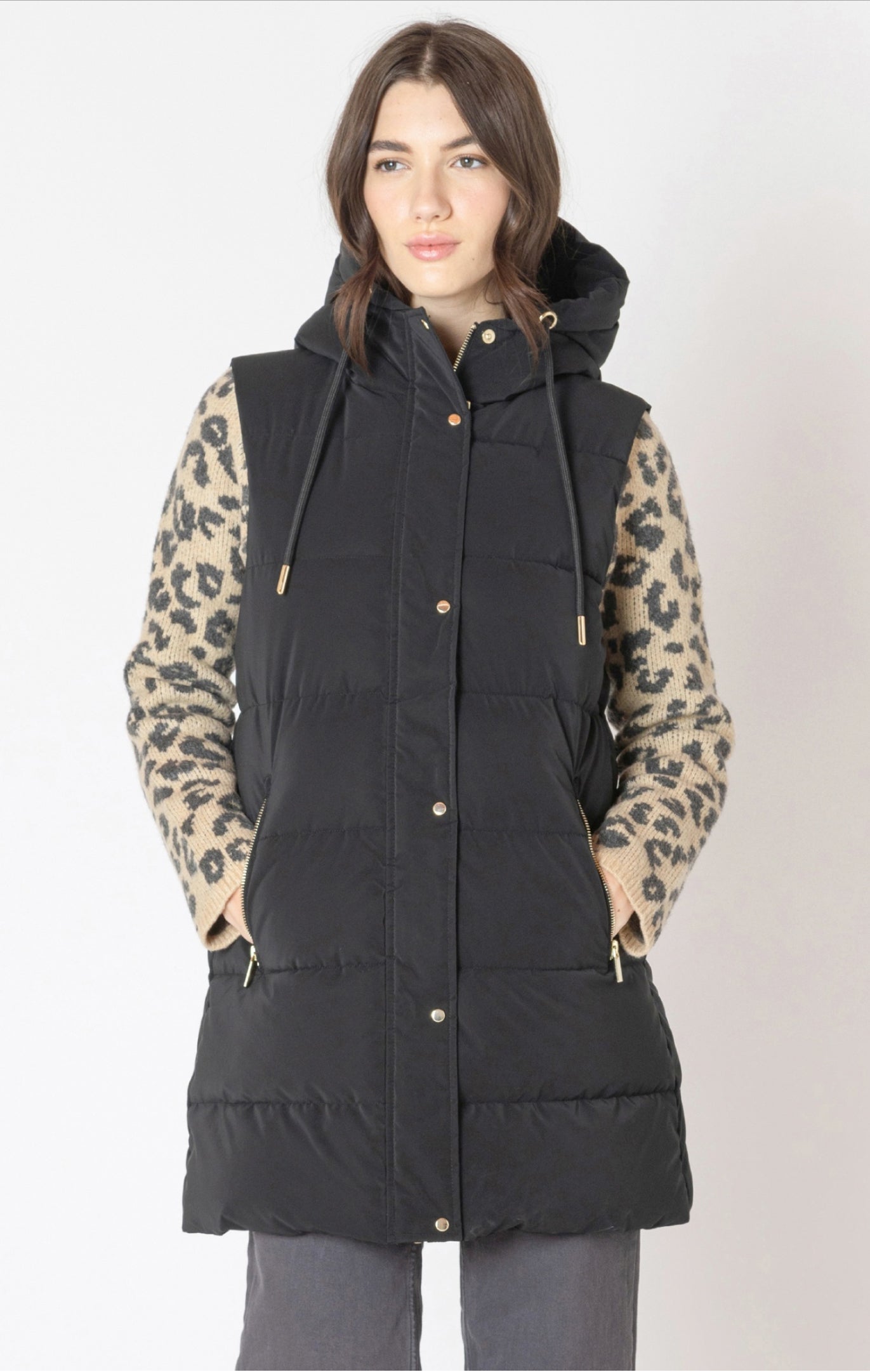 Stay warm and stylish this fall with the Dex puffer vest. Crafted with durable polyester fabric, this knee-length vest features a hood and gold hardware. The matte black color adds a touch of sophistication while keeping you cozy. Perfect for fall 2025.