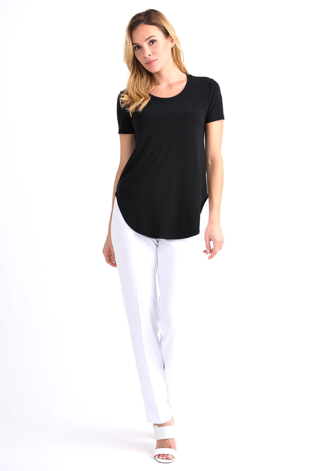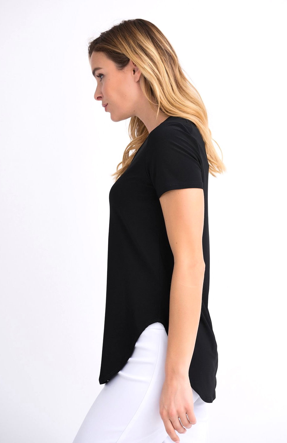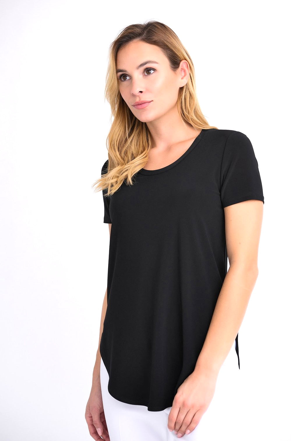 in black. This Joseph Ribkoff Tunic Tee is great as a layering piece or on its own. It features short sleeves, a rounded neckline, a rounded hemline with side slits, and a slightly tailored fit through the natural waist. You'll love the silky feel.