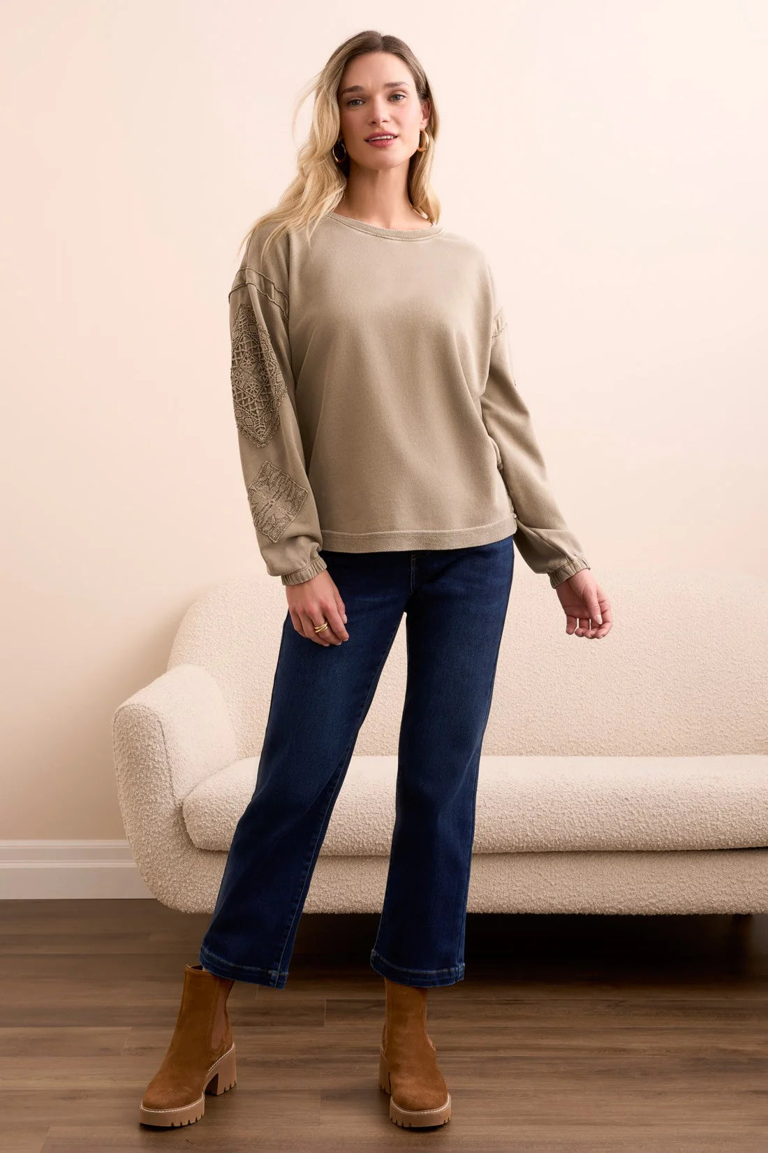 Tribal Embroidered Sleeve Sweatshirt Olive Leaf