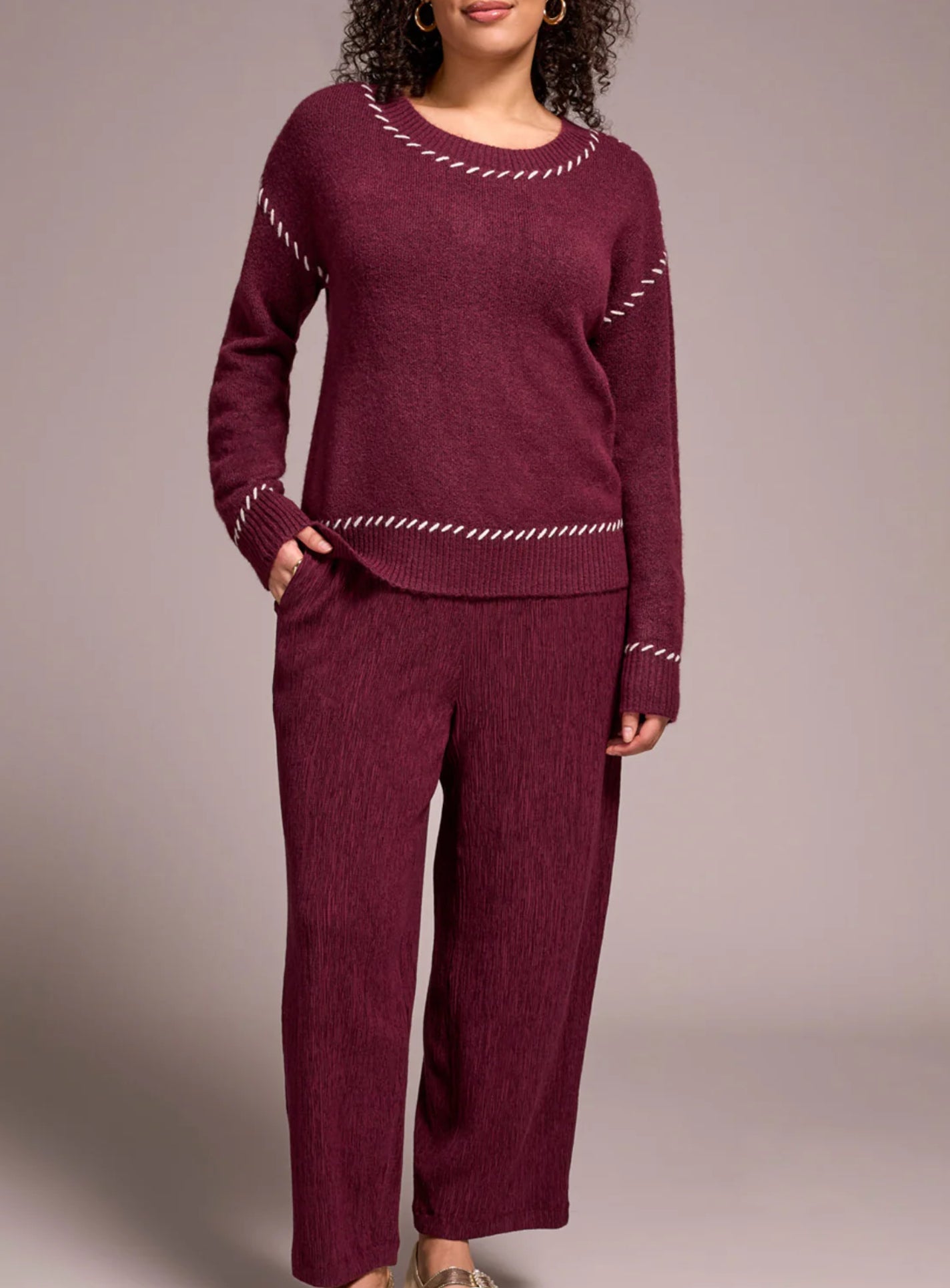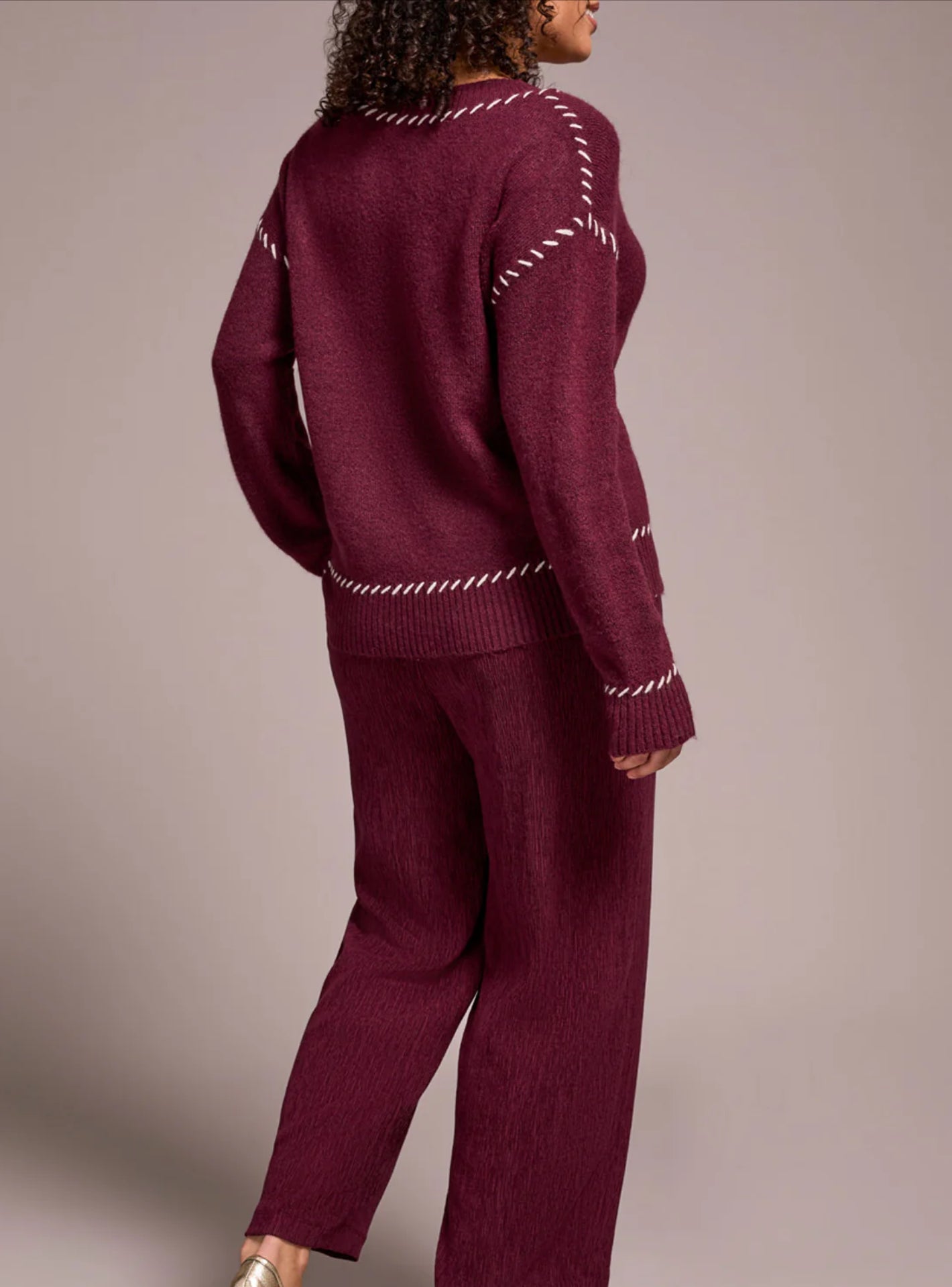 Stay cozy in style in this fun and fabulous long sleeve crew neck sweater. Featuring long sleeves, drop shoulders and blanket stitch detail. Soft cozy knit. Perfect with jeans or pants. Super versatile and fashionable!